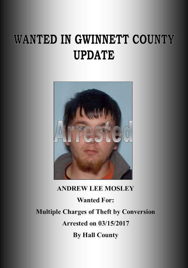 Andrew Mosley, of Flowery Branch, was wanted on 13 misdemeanor counts and one felony count of theft by conversion.