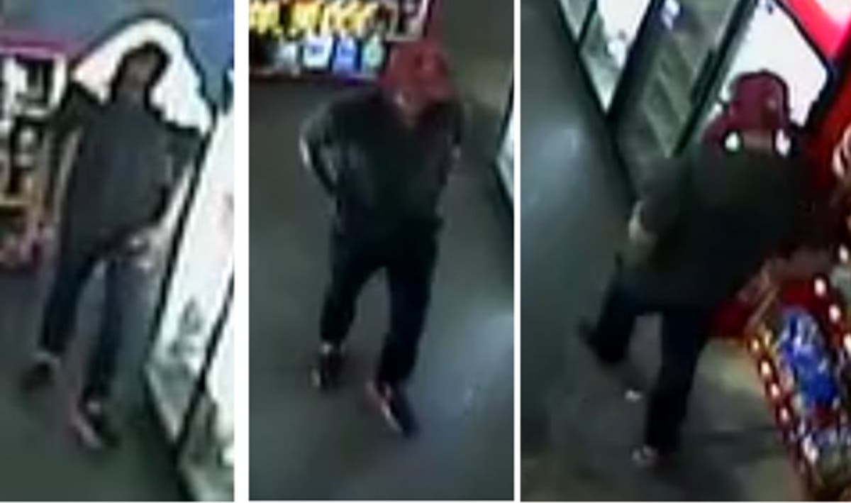 The man is initially wearing a black T-shirt, black pants, black and red shoes, and a white T-shirt on his head. According to police, he walks up to the counter and asks for a pack of Newport 100s. The clerk requests to see his ID and he claims to not have it on him. He tells the clerk he needs to go get it and leaves.