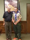 Conyers Major Randy Mills, left, is pictured with Dustin Dorman age 17, a senior at Rockdale County High School who was honored at a recent City Council meeting for achieving the rank of Eagle Scout March 19, 2016, and for going above and beyond the call of duty for the Conyers Community. Dorman, has logged in more than 400 hours of community service, including, organizing a canned food drive for the Rockdale County Emergency Relief fund where he collected 876 food items and cleaning up at the Walk of Heroes Veterans War Memorial. Dorman also serves as the Cadet Commander of the Civil Air Patrol Auxiliary and is a Gunnery Sergeant of the Marine Corps Junior ROTC. He plays trombone in the Symphonic band. Dorman has earned 46 Merit Badges and has earned his first Palm. His Eagle Scout Project consisted of two wooden benches and two wooden fishing rod holders on the bank of Randy Pointer Lake by the main dock at Black Shoals Park, Conyers. Remarkably Dorman, is going on his 7th consecutive year of perfect attendance in school. After graduation May 2017, Dorman plans on joining the US Air Force, where he would like to serve 20 years and work as an inflight refueler and attend college.