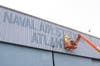 As part of an upgrade to Hangar 5 at Dobbins Air Reserave Base on April 17 construction crews removed signage from the structure that could be considered the last reminder of the existence of the former Naval Air Station Atlanta.