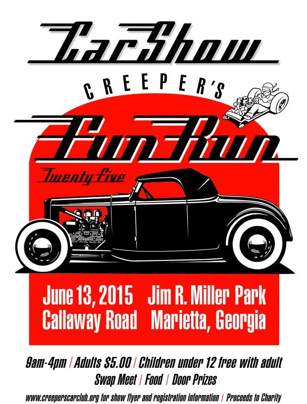 Event information is as follows: The 25th annual car show sponsored by the Creeper’s Car Club will be held June 13, 2015 at Jim R Miller Park, 2245 Calloway Road, Cobb County, Marietta, Georgia.