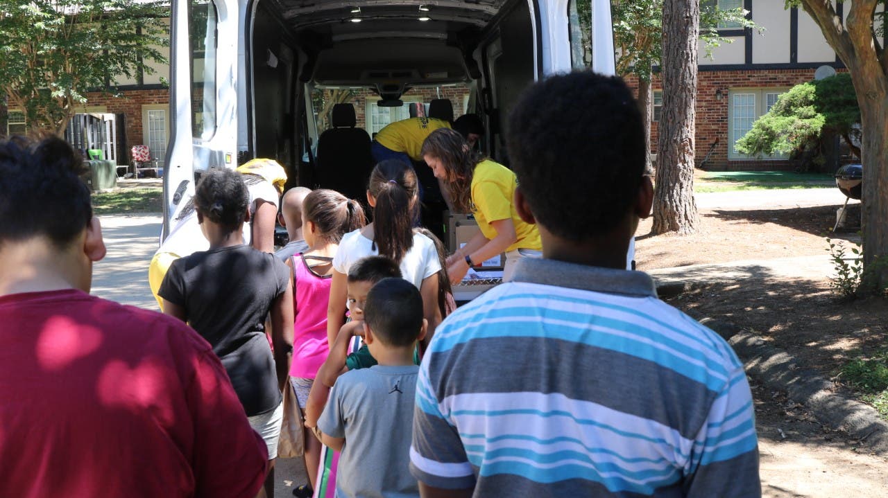 “On Fridays, the bookmobile is distributing on two of our routes in the Smyrna area,” explained Dr. Ike Reighard, MUST Pres. and CEO. “Library staff and MUST volunteers meet in housing areas where children in need receive both a lunch and a book. The youngest children often gather in small groups and listen to older children read stories.”