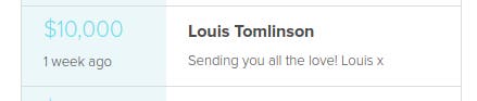 "Rylee, I found you thanks to Zayn and Louis," one donor wrote. "I love your music taste, and hope you and your loved ones are having a wonderful day."