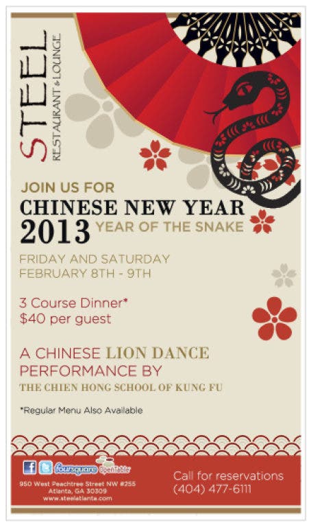 To bring in the 2013 Chinese New Year, Steel Restaurant & Lounge, located in the heart of midtown, has planned a celebration for guests looking to feed their eyes and their bellies. Besides an amazing 3-course meal Steel has also invited the Chien Hong School of Kung Fu to perform the traditional Chinese Lion Dance.