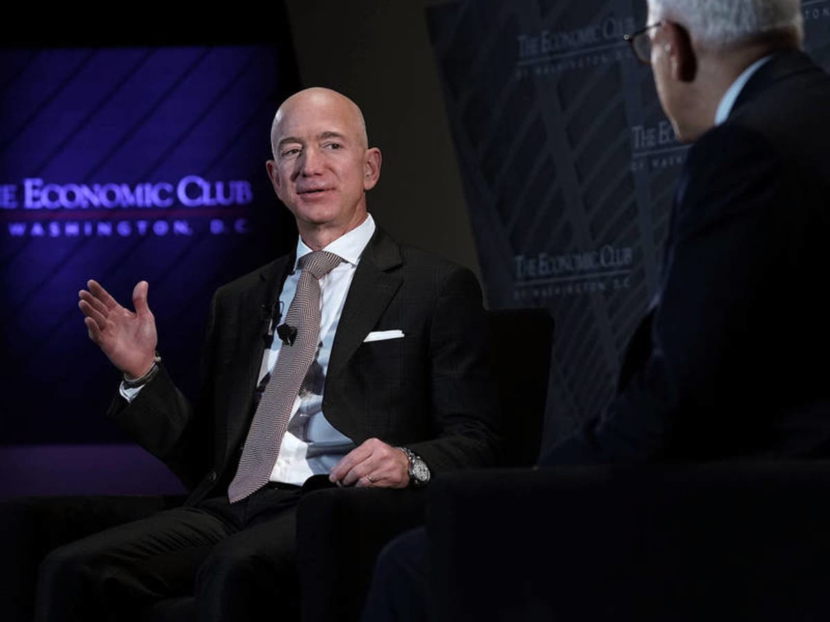 WASHINGTON, DC - SEPTEMBER 13: CEO and founder of Amazon Jeff Bezos participates in a discussion during a Milestone Celebration dinner September 13, 2018 in Washington, DC. Economic Club of Washington celebrated its 32nd anniversary at the event. (Photo by Alex Wong/Getty Images)