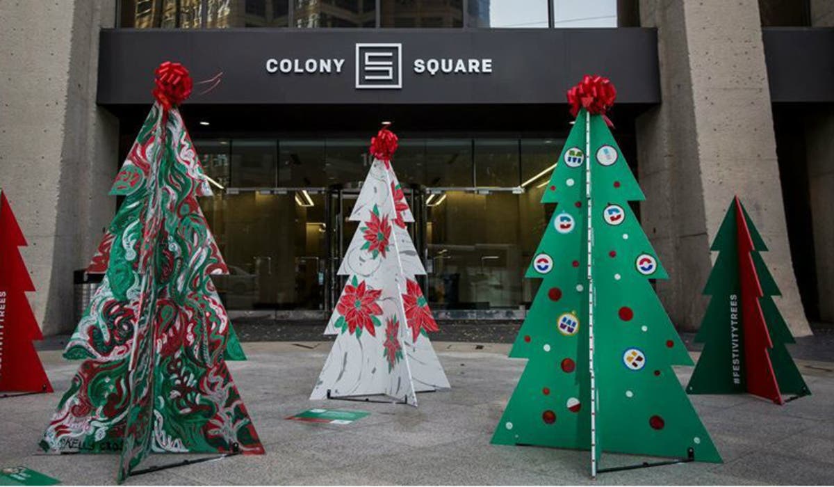 Image: Hand-painted Christmas trees stand before the Plaza at Colony Square during the 2016 Christmas season (The Wilbert Group).