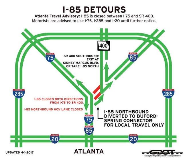 βI want to extend a sincere thank you to our first responders and other state and local employees who have worked tirelessly since Thursday night,β said Deal. βIβd also like to thank our citizens, especially those near the I-85 site, motorists and private organizations for their patience, understanding and willingness to work together during this time. We encourage everyone to continue using caution and exercising good judgment on the roads going forward. We have undertaken several initiatives to safely and expeditiously move traffic and will continue working with state, federal and local authorities to ensure timely repairs, safe alternative routes for motorists and access to mass transit systems.β