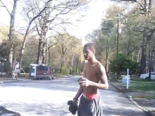 Police describe the suspect as a black male with tattoos and short hair who was wearing grey pants over red shorts.