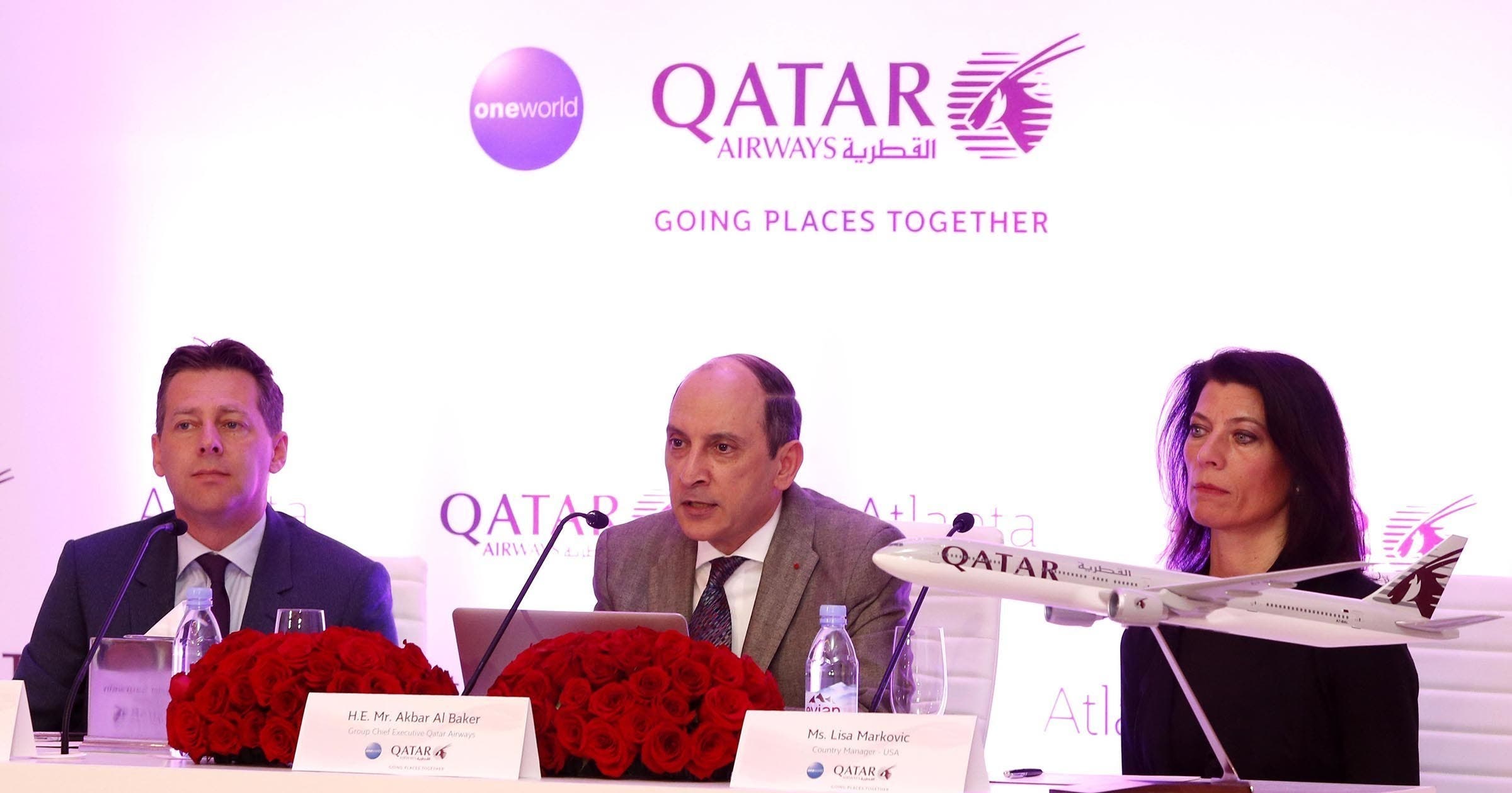 - Image: Qatar Airways holds press conference to mark the start of the airline's Atlanta route launch on June 1. Qatar Airways Group Chief Executive, His Excellency Mr. Akbar Al Baker (centre), Qatar Airways Vice President Americas - Gunter Saurwein (left) and Country Manager - USA, Lisa Markovic. (PRNewsFoto/Qatar Airways)