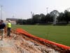 Indoor lights hang high above the perimeter of the field, replicating the lighting one would expect to see in an outdoor stadium. A viewing platform surrounds the field, and upon completion there will be a camera system mounted in the ceiling, allowing practices to be filmed. The field will also have a single field goal located at the north end of the facility, same as the outdoor field, since “Coach Johnson’s offense always drives north,” as Mr. McFadden noted in his presentation.