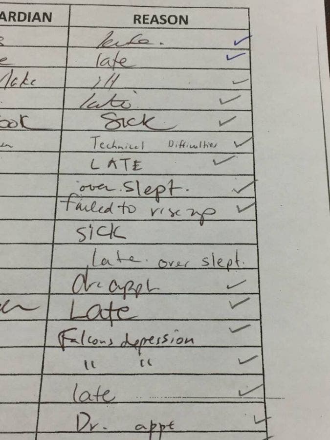 At GAC, two other students on the tardy list cited "Falcons depression" as their excuse.