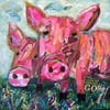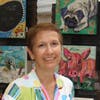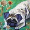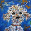 I would describe my art as whimsical acrylics on board or canvas. The subject matter is usually dogs, cats and other animals. I also paint kids with three-dimensional items on pieces of roofing tin.