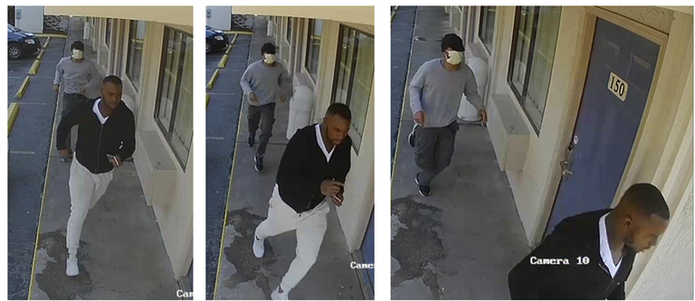 - Suspect #1: Black male, 25-35 years old, short hair, trimmed beard, wearing a dark blue hooded sweatshirt, white sweat pants and white shoes