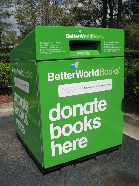 Gwinnett Public Library partners with Better World Books to collect unwanted books in green bins.