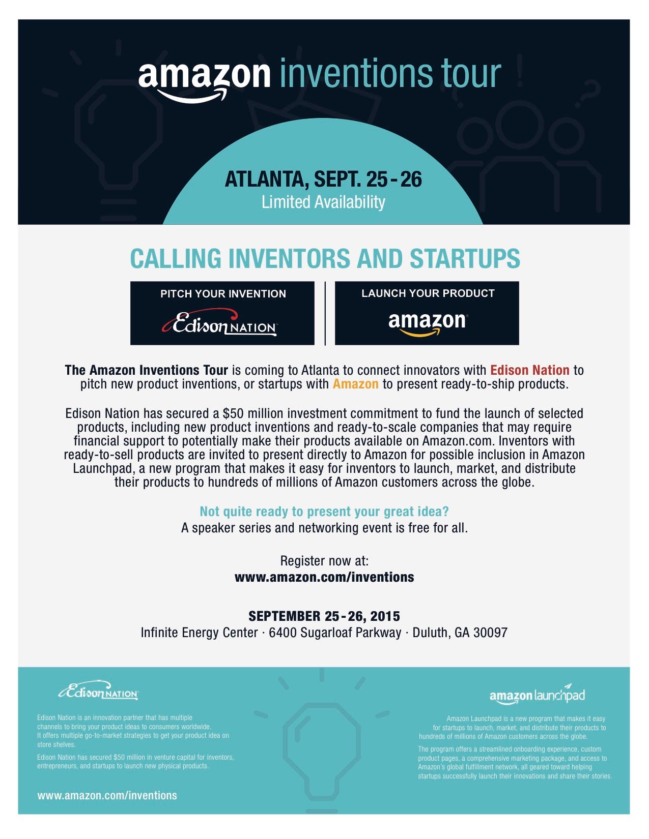 Edison Nation, the go-to innovation marketplace and online community for independent inventors, is teaming up with Amazon to host the Amazon Inventions Tour in Atlanta beginning Friday, September 25, 2015 through Saturday, September 26, 2015 from 7AM to 7PM EST at the Infinite Energy Center in Duluth, GA (formerly Gwinnett Center).