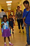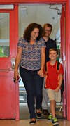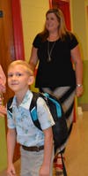 Photo caption 3: Gabriel McDonald walks proudly to his first grade classroom after being greeted by SPS Director Meredith Moseley.