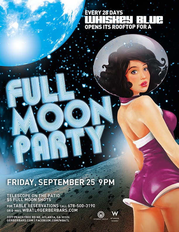 Whiskey Blue at W Atlanta - Buckhead is opening its door for another Full Moon Party! Join us on the rooftop for a telescope view of the sky, and $5 Full Moon Shots on Friday, September 25th at 9:00 PM.