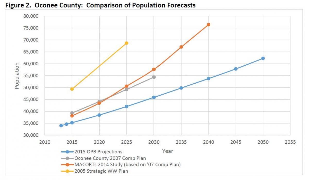 The county provided the projections to the EPD to support its request that it be allowed to discharge 1.5 million gallons per day of treated wastewater into Calls Creek from its existing plant on that stream off North Main Street on the northern edge of Watkinsville.