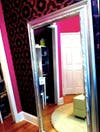 Groovy wallpaper is not damaging to the wall – it just peels off if you ever want to take it down. Wallpaper is French Kiss from DesignYourWall.com. Large mirror (Picture #6) was purchased from a nice guy on Craigslist. It was kind of a hideous bronze color until it was spray painted shiny silver! Now it looks glamorous and I love it!