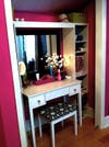 The nook's paint color is Velspar “Cosmic Pink”, which looks fabulous against white boarders and accents. Little vanity dressing table and bench came from Target (white vanity set). I changed out the knobs with little crystal knobs from Lowe’s. Small details, like a rotating jewelry holder (Picture #4) shows off the prettiest stuff and keeps sparkly treasures at arm’s reach on built-in shelves nestled on both sides of the vanity.
