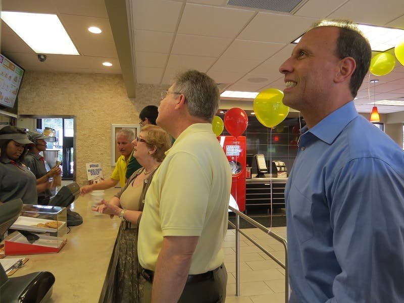 (Photo: Mayor Mike Mason, center, and council members Phil Sadd and Lorri Christopher check out the menu at the newly renovated Burger King on Peachtree Industrial Boulevard and Medlock Bridge Road. Credit: City of Peachtree Corners)