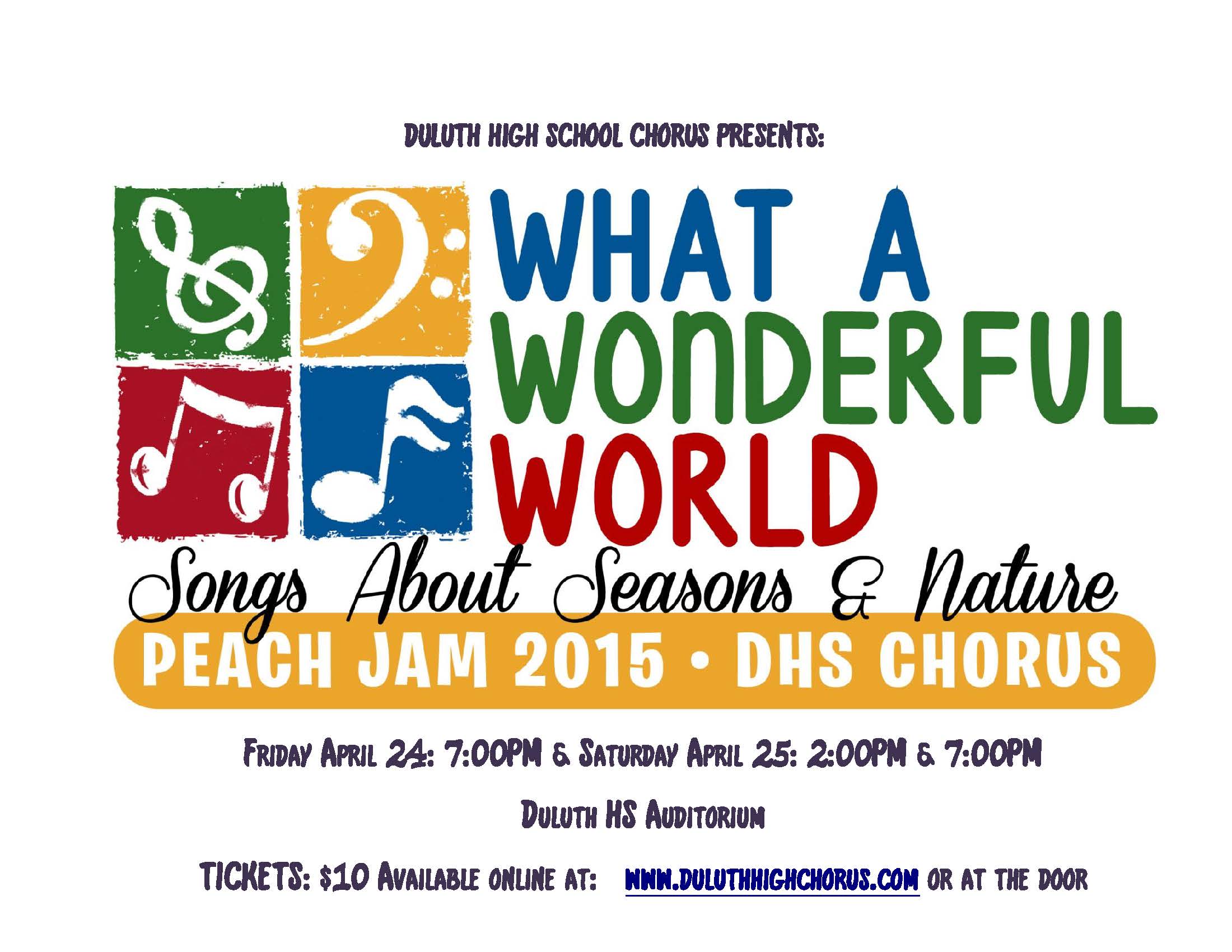 The Duluth High School Chorus presents Peach Jam 2015 -” What a Wonderful World!”, as their 19th annual musical variety show - April 24th at 7 PM and April 25th at 2 PM and 7 PM at the Duluth High School Auditorium, 3737 Brock Road, Duluth, GA.