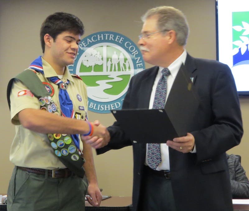 On Tuesday evening the Mayor and Peachtree Corners City Council had the pleasure of recognizing one of its citizens for achieving the rank of Eagle Scout, the highest level in Scouting.