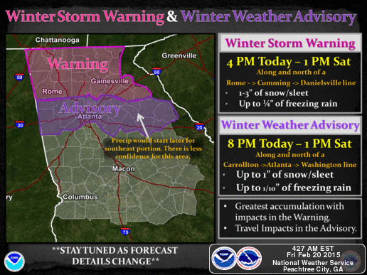 The advisory is in effect from 8 p.m. Friday to 1 p.m. Saturday along and north of a line from Carrollton to Atlanta to Washington. Up to 1 inch of snow/sleet and a tenth of an inch of freezing rain is possible.