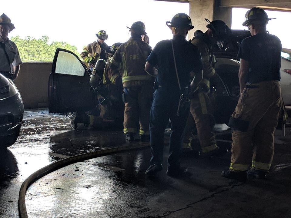 Crews with the Roswell and Alpharetta fire department responded to the fire June 25 on the third level of the deck at 4500 Hospital Boulevard. They arrived to find the fire to the passenger vehicle "fully involved," the agency added.