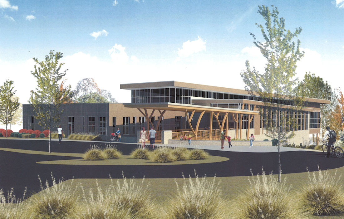 A welcoming covered bridge entry leads visitors into the space where they are immediately presented with views through the building and into the natural landscape beyond. The community will enjoy and use its meeting room, study rooms and separate spaces for children and teens.