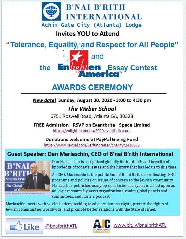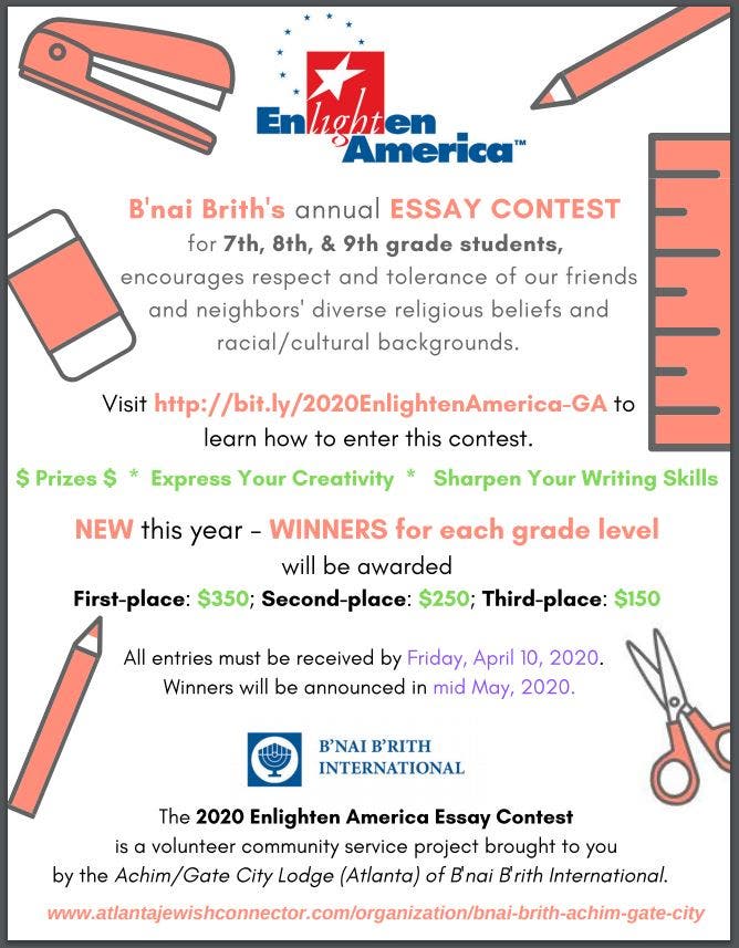 The 2020 Enlighten America Essay Contest is a volunteer community service project brought to you by the Achim/Gate City Lodge of B’nai B’rith International.