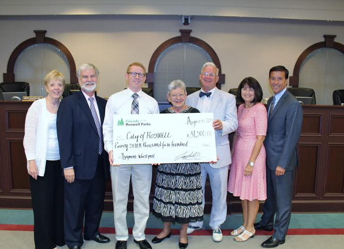 Photo: Jay Small, president of Friends of the Roswell Parks, and Bettye Prescott, president of the Roswell Ramblers, presents a donation to Mayor Jere Wood and members of the Roswell City Council. Credit: city of Roswell