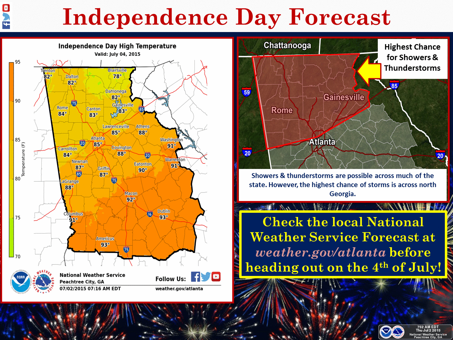 Your Fourth of July plans should include an umbrella, according to the National Weather Service in Peachtree City, which said showers and thunderstorms are possible for much of the state on the holiday.