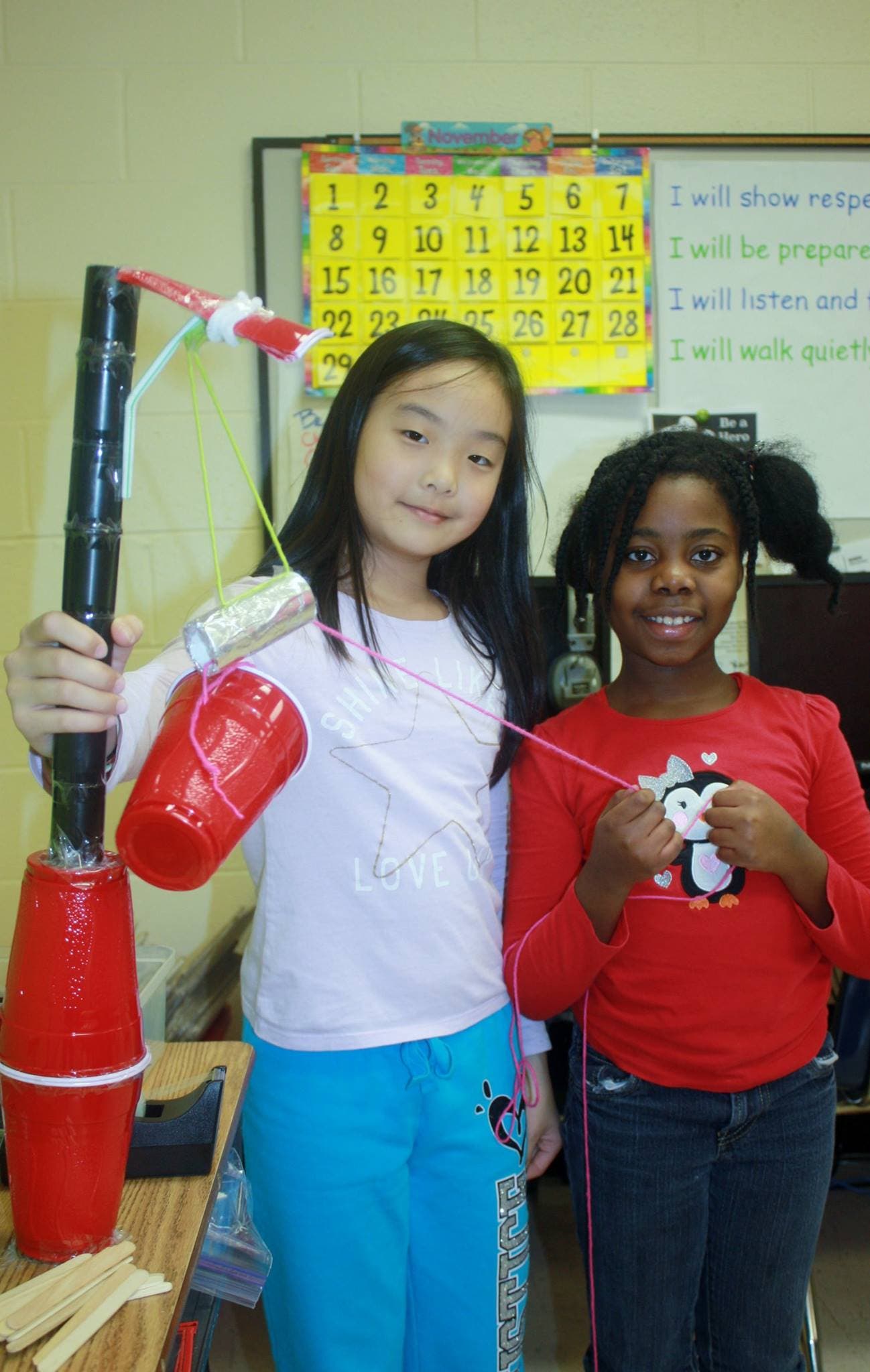 Photo: River Eves students Chloe Cheng, left, and Nicke Thomas proudly show their pulley project created at the STEM-certified school that was recently awarded a $7,500 grant from Project Lead The Way and The Goizueta Foundation to further its STEM curriculum. Credit: River Eves Elementary School