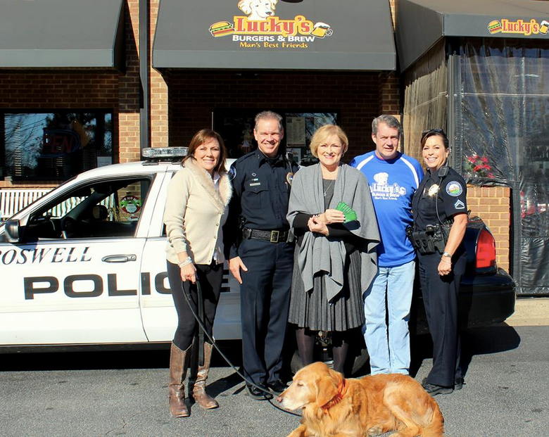 Photo: from left to right, Diane Geyer (Lucky the dog’s mom), Chief Rusty Grant, The Drive House Executive Director Kathy Swahn Lucky’s General Manager Ted Lescher, Officer Lisa Holland and Lucky the dog. Credit: Roswell Police Department