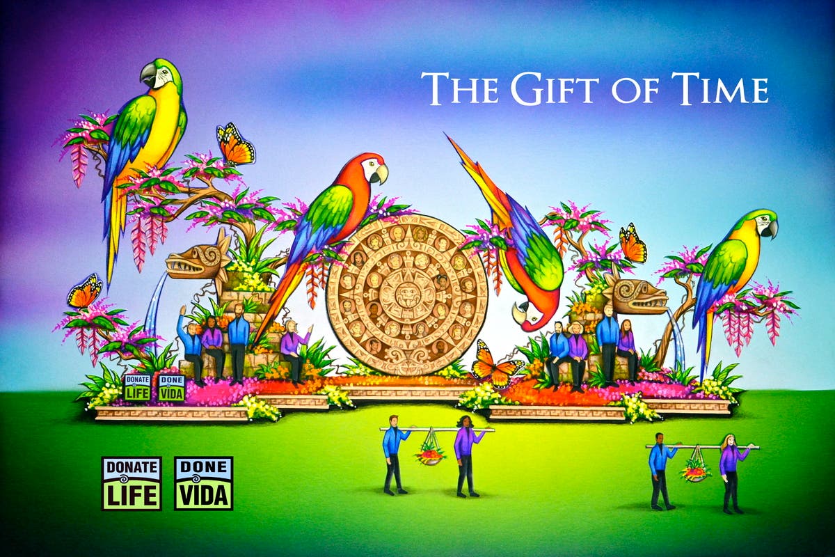 The Gift of Time float depicts a vibrantly colored, tropical backdrop that dates back to the ancient civilizations of Mexico. It celebrates the gift of life as costumed riders sit alongside the jungle, against stone carvings, drawing on the strength they have gained from their donors to continue and thrive on life’s journey. Families of deceased donors are honored to see their loved ones’ floral images highlighted as part of the float. Living donors and recipients bring the float to life by riding or walking beside the float.