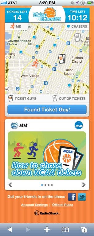 The exclusive wireless sponsor of the NCAA has partnered with RadioShack on 'AT&T Ticket Chasers,' an interactive campaign which lets fans use their mobile phones to uncover game tickets. The chase happening in Atlanta takes place on Wednesday, 3/21.