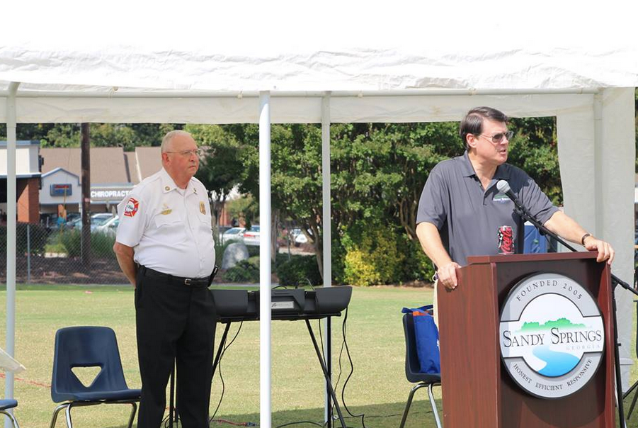 (Photo: Sandy Springs Mayor Rusty Paul, right, speaks to the crowd as Chief Jack McElfish looks on. Credit: city of Sandy Springs)