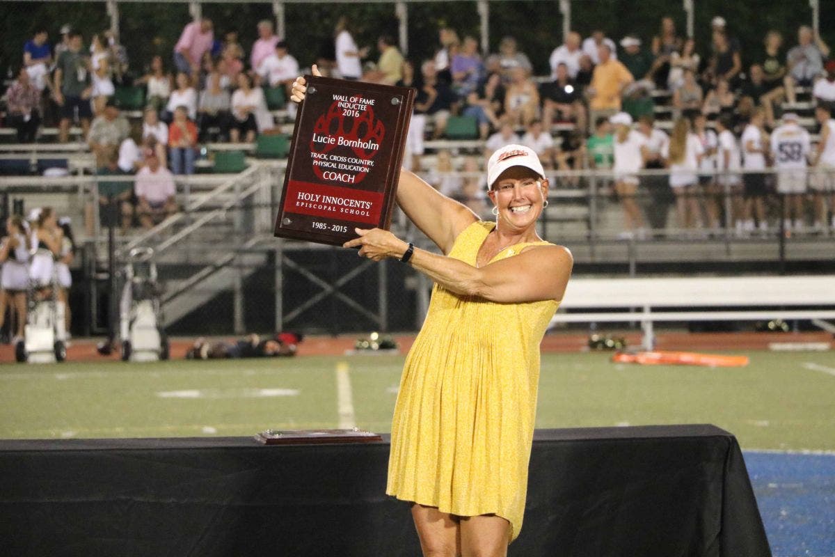Five of Holy Innocents’ all-time best athletes/coaches were inducted into the Wall of Fame Friday night, Sept. 23rd during halftime of the HIES-Wesleyan football game. The Wall of Fame was established in 2008; it recognizes and honors outstanding varsity athletes, coaches, and/or contributors who have demonstrated excellence in their athletic pursuits.