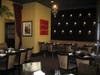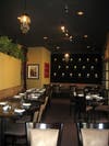 Entering the doors of the restaurant, the tone is set by the warm mix of stylish contemporary décor with vibrant Middle Eastern touches and a peek into the kitchen through an arched tile opening. Butterscotch walls liven with dramatic splashes of red and black artwork, sleek black tables and, caramel upholstered banquettes and chairs are framed by the soft glow of ornatedly rimmed globe ceiling lights and a flickering wall of candles. A covered patio flanked by large leafy plants and a Zen-like slate stone fountain, extends the dining area.