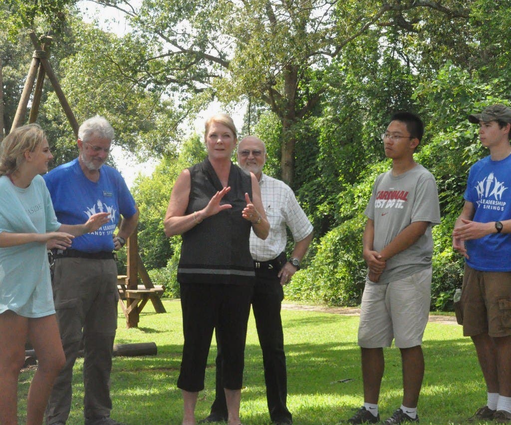 (Photo: Melanie Couchman (foreground) speaks to the Youth Leadership Sandy Springs students as Hope Garrison (far left) of Riverwood International Charter School, Youth Leadership Sandy Springs volunteer Howard Austin, David Couchman, Derek Liu and Chandler Grove of Mt. Vernon Presbyterian School listen. Credit: Leadership Sandy Springs)