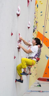 Photo 1: Luke Muehring races to the top in the 2015 National Youth Climbing Championships’ speed climbing competition held at Stone Summit Gym in Kennesaw, Georgia, this summer. He scaled the 60 foot wall in 7.61 seconds!