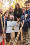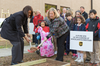 Photo 1: Rhonda Clark of UPS (left) and Woodland Elementary School Principal Amy Gamble break ground on the sustainable food garden as students watch.