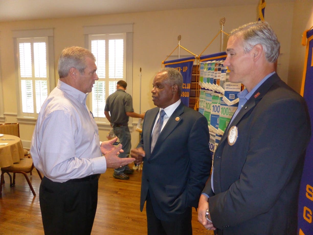 (Left to Right): Rotarian Snyder Turner and Congressman David Scott chat as Smyrna Rotary Club President Scott Auer looks on. Photo credit: Narayan Sengupta