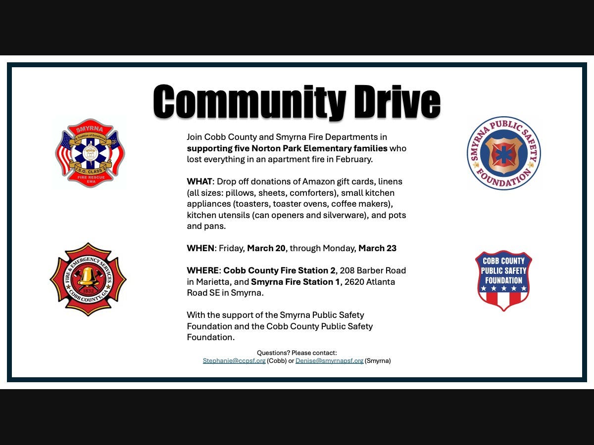 The Cobb County and Smyrna fire departments are collecting donations for five families at Norton Park Elementary School who lost their belongings in an apartment fire in February, with two local public safety foundations helping coordinate the effort.