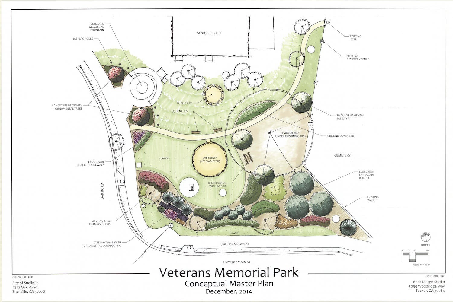 Snellville Arts Commission proposed the labyrinth to sit between the Veterans Memorial and cemetery at Oak Road and Hwy 78 near City Hall.