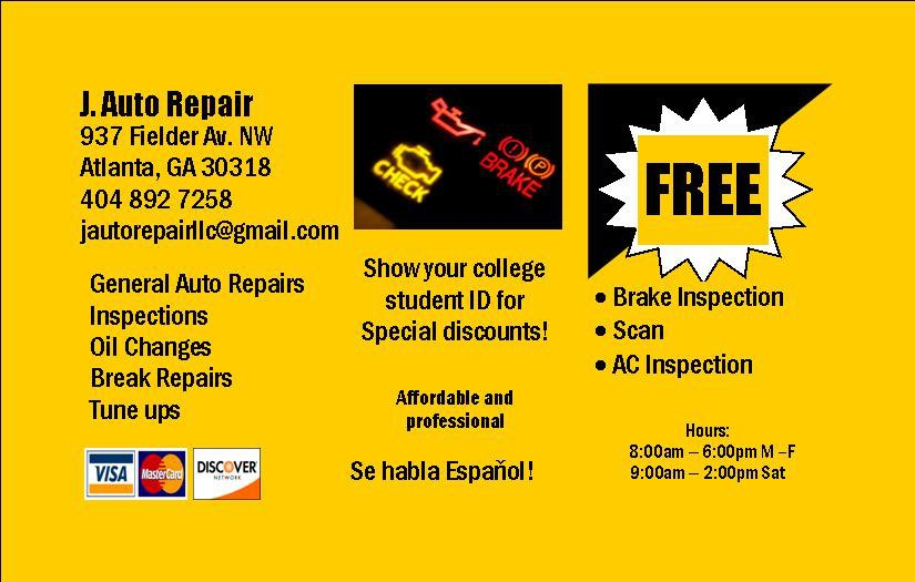 THANKSGIVING SPECIAL!! BY APPOINTMENT ONLY!!! CONEVNTIONAL OIL CHANGE AND RADIATOR FLUSH STARTING AT 80.99 * most vehicles* offer valid until NOVEMEBR 30,2013 BY APPOINTMENT ONLY!!!! Call us to schedule an appointment at 404-892-7258 J Auto Repair LLC. Hablamos Espanol. We are located on 937 Fielder Ave. NW, Atlanta GA, 30318