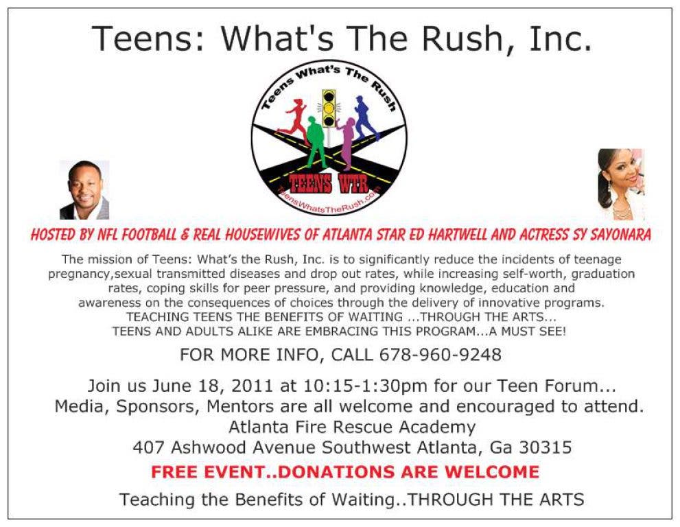 NFL Football & Real Housewives Star Ed Hartwell and Actress Saynora in conjunction with Teens, What's The Rush, Inc.. will host a Teen Forum to encourage our teens.