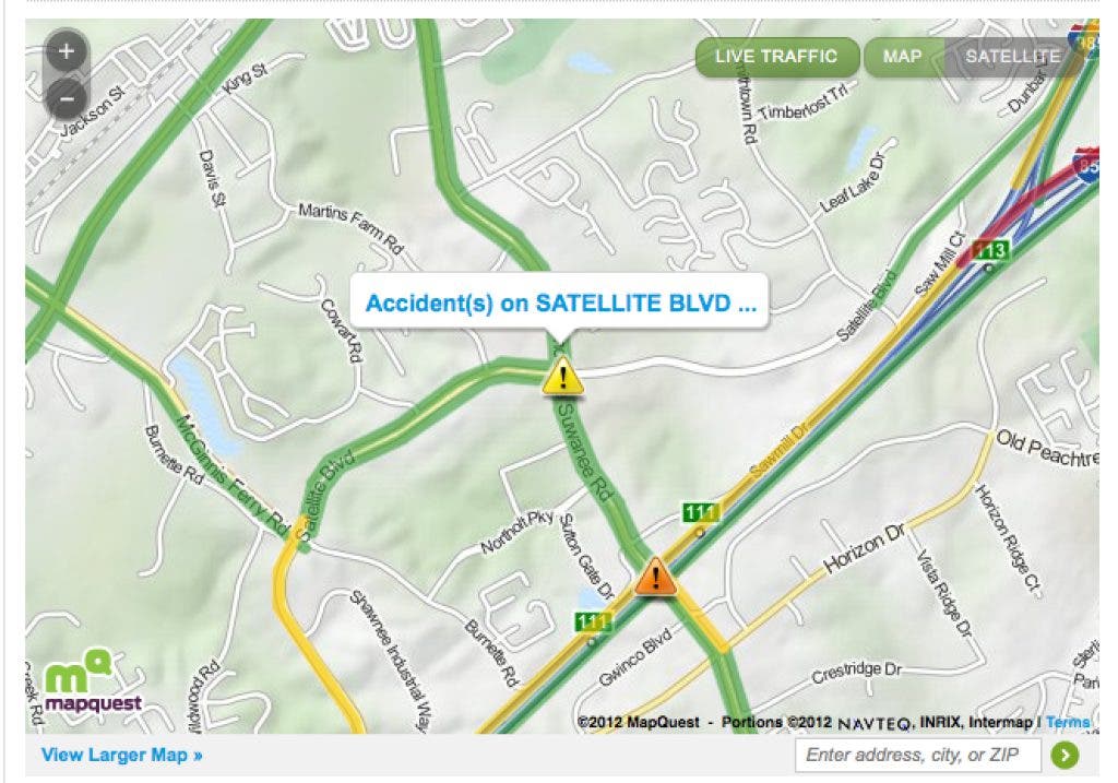 - An overturned vehicle at the intersection of Lawrenceville-Suwanee Road and Satellite Boulevard. This intersection also is subject to lane closures because of road work being done in connection with the QuikTrip being constructed there. No alerts now appear.