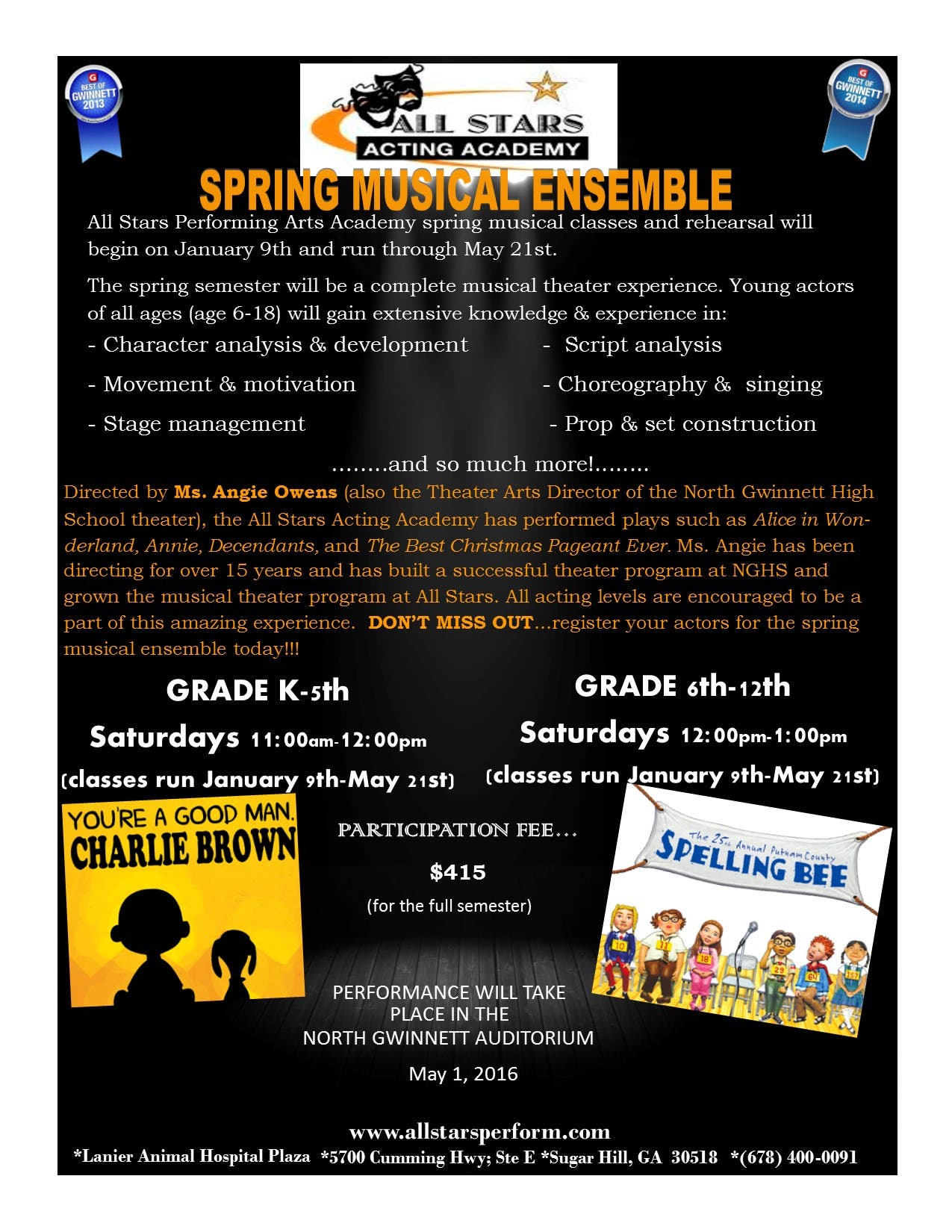2016 is right around the corner...and ALL STARS Performing Arts Acting Department is getting ready to start the spring semester with two fantastic musicals!! Don’t miss out...sign your actor up for our spring musicals TODAY!!! 2016 is going to be GREAT for the All Stars actors!!